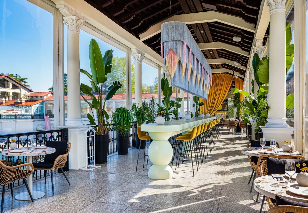 Воздушный, наполненный солнечным светом интерьер не перегружен деталями и радует глаз яркими цветами, а обилие зелени и очаровательный вид на марину создают ощущение оазиса, в котором можно укрыться от шума и суеты туристического центра.